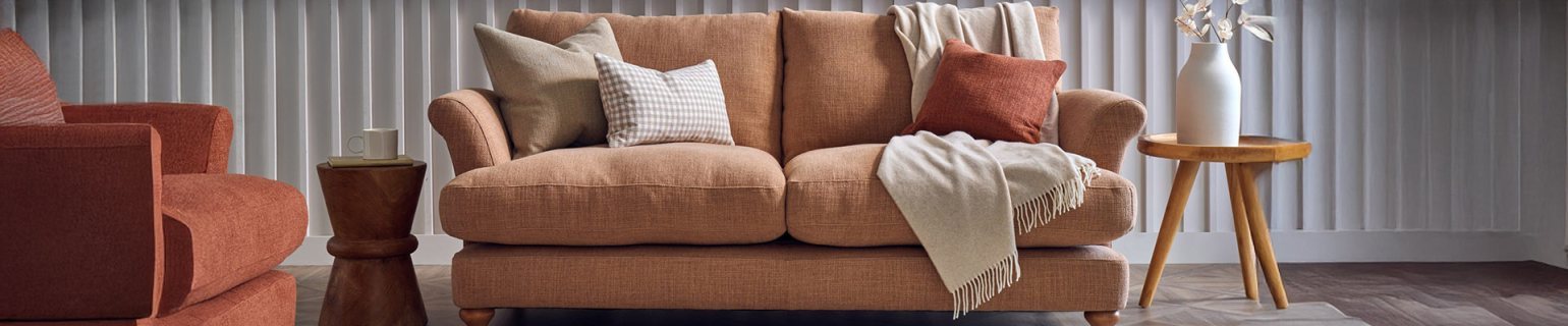 With its plump seat and back cushions, feather filled scatter cushions and turned wooden feet in a great range of wood colour choices, the Vanessa sofa collection is both pleasing to the eye and body. This super stylish range has slim curved arms and plump supporting back cushions and is available in a great range of sofa sizes and fabric grades and colours. With its ability to suit those looking for a traditional or contemporary feel to their sitting room, the Vanessa is an all round great buy. Choose from a 4 seater sofa, 3.5 seater sofa, 3 seater sofa, 2 seater sofa, snuggler and armchair and perfect your relaxation zone in your home.